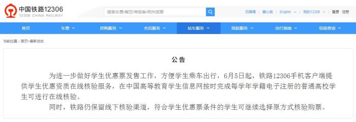 同時(shí),鐵路仍保留線下核驗(yàn)渠道,符合學(xué)生優(yōu)惠票條件的學(xué)生可繼續(xù)選擇原方式核驗(yàn)購(gòu)票。