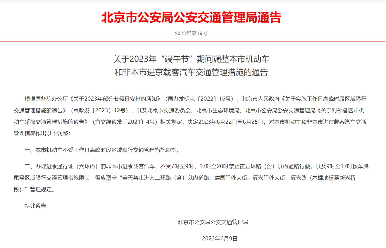北京:2023年端午節(jié)期間機(jī)動(dòng)車尾號(hào)不限行