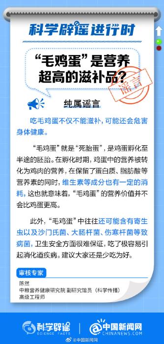 純屬謠言!“毛雞蛋”就是“死胎蛋”,是雞蛋孵化至半途的胚胎。“毛雞蛋”的營養(yǎng)價值并不比雞蛋更高,其中還可能含有寄生蟲以及沙門氏菌、大腸桿菌、傷寒桿菌等致病菌,衛(wèi)生安全很難保證,吃了極容易引起消化道疾病。(來源:科學辟謠、中國新聞網(wǎng)微博)