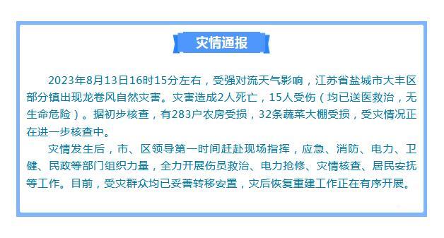 中新網(wǎng)8月13日電 據(jù)江蘇鹽城大豐區(qū)委區(qū)政府官方微信消息,8月13日16時(shí)15分左右,受強(qiáng)對(duì)流天氣影響,江蘇省鹽城市大豐區(qū)部分鎮(zhèn)出現(xiàn)龍卷風(fēng)自然災(zāi)害。災(zāi)害造成2人死亡,15人受傷(均已送醫(yī)救治,無(wú)生命危險(xiǎn))。據(jù)初步核查,有283戶農(nóng)房受損,32條蔬菜大棚受損,受災(zāi)情況正在進(jìn)一步核查中。