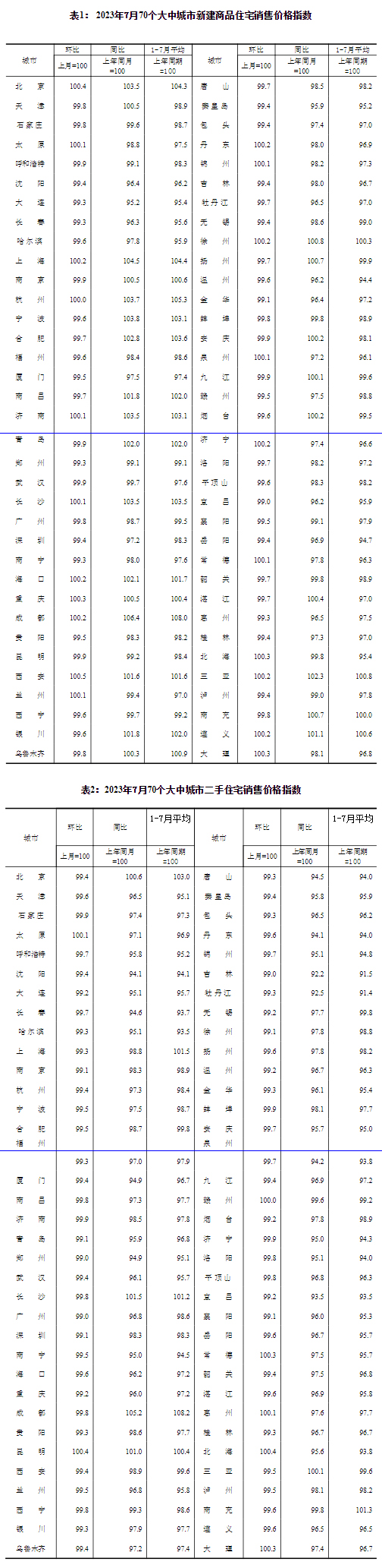 從新建商品住宅看,7月份,一線城市新建商品住宅銷售價格環(huán)比連續(xù)兩月持平,其中北京和上海環(huán)比分別上漲0.4%和0.2%,廣州和深圳環(huán)比分別下降0.2%和0.6%;二線城市新建商品住宅銷售價格環(huán)比由上月持平轉(zhuǎn)為下降0.2%;三線城市新建商品住宅銷售價格環(huán)比下降0.3%,降幅比上月擴大0.2個百分點。從二手住宅看,7月份,一線城市二手住宅銷售價格環(huán)比下降0.8%,降幅比上月擴大0.1個百分點;二線城市二手住宅銷售價格環(huán)比下降0.5%,降幅比上月擴大0.1個百分點;三線城市二手住宅銷售價格環(huán)比下降0.4%,降幅與上月相同。