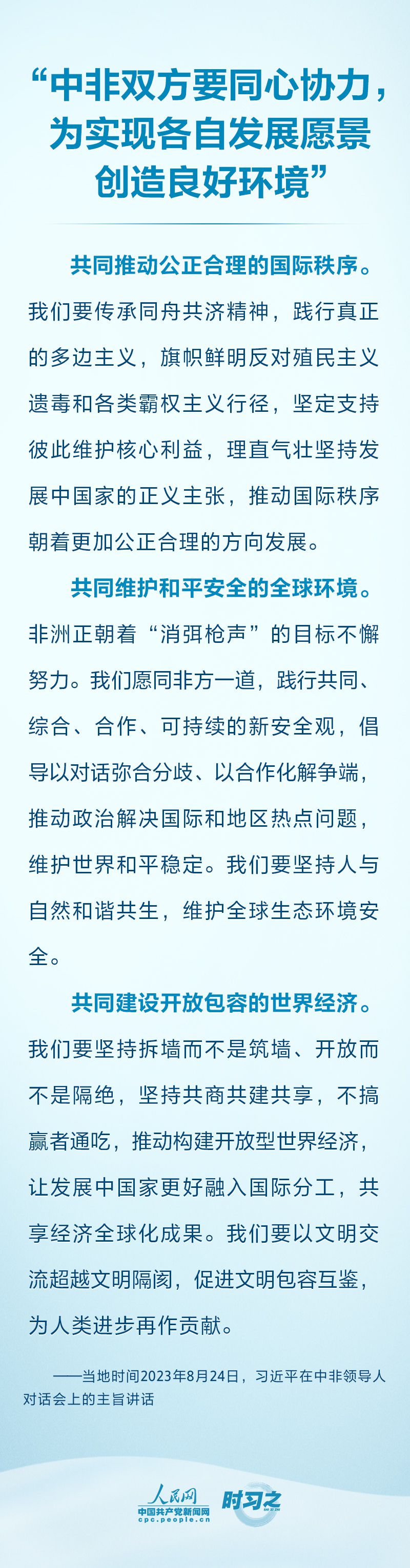 習(xí)近平呼吁中非雙方要同心協(xié)力,為實現(xiàn)各自發(fā)展愿景創(chuàng)造良好環(huán)境;并為規(guī)劃好下階段中非務(wù)實合作,提出3項舉措。