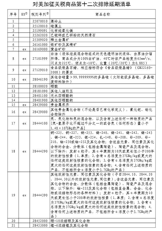 國務(wù)院關(guān)稅稅則委員會公布對美加征關(guān)稅商品第十二次排除延期清單