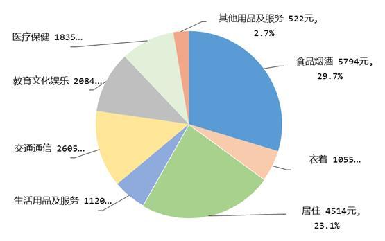 前三季度,全國居民人均食品煙酒消費支出5794元,增長6.7%,占人均消費支出的比重為29.7%;人均衣著消費支出1055元,增長6.5%,占人均消費支出的比重為5.4%;人均居住消費支出4514元,增長6.4%,占人均消費支出的比重為23.1%;人均生活用品及服務(wù)消費支出1120元,增長7.4%,占人均消費支出的比重為5.7%;人均交通通信消費支出2605元,增長11.3%,占人均消費支出的比重為13.3%;人均教育文化娛樂消費支出2084元,增長16.4%,占人均消費支出的比重為10.7%;人均醫(yī)療保健消費支出1835元,增長15.0%,占人均消費支出的比重為9.4%;人均其他用品及服務(wù)消費支出522元,增長17.4%,占人均消費支出的比重為2.7%。