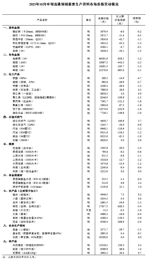 中新網(wǎng)10月24日電 國(guó)家統(tǒng)計(jì)局網(wǎng)站發(fā)布2023年10月中旬流通領(lǐng)域重要生產(chǎn)資料市場(chǎng)價(jià)格變動(dòng)情況。2023年10月中旬與10月上旬相比,8種產(chǎn)品價(jià)格上漲,37種下降,5種持平。其中液化天然氣(LNG)價(jià)格環(huán)比漲5.7%,天然橡膠(標(biāo)準(zhǔn)膠SCRWF)價(jià)格環(huán)比漲4.2%,棉花價(jià)格環(huán)比跌3.4%,生豬(外三元)價(jià)格環(huán)比跌1.9%。(中新財(cái)經(jīng))