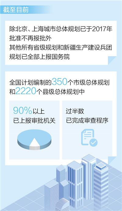 自然資源部國土空間規(guī)劃局局長張兵介紹,截至目前,除北京、上海城市總體規(guī)劃已于2017年批準不再報批外,其他所有省級規(guī)劃和新疆生產(chǎn)建設(shè)兵團規(guī)劃已全部上報國務(wù)院,其中江蘇、廣東、寧夏等省級規(guī)劃已經(jīng)批復(fù)。全國計劃編制的350個市級總體規(guī)劃和2220個縣級總體規(guī)劃中,90%以上已上報審批機關(guān),過半數(shù)已完成審查程序,江蘇、廣東的部分市級總體規(guī)劃已由省級人民政府批準實施。