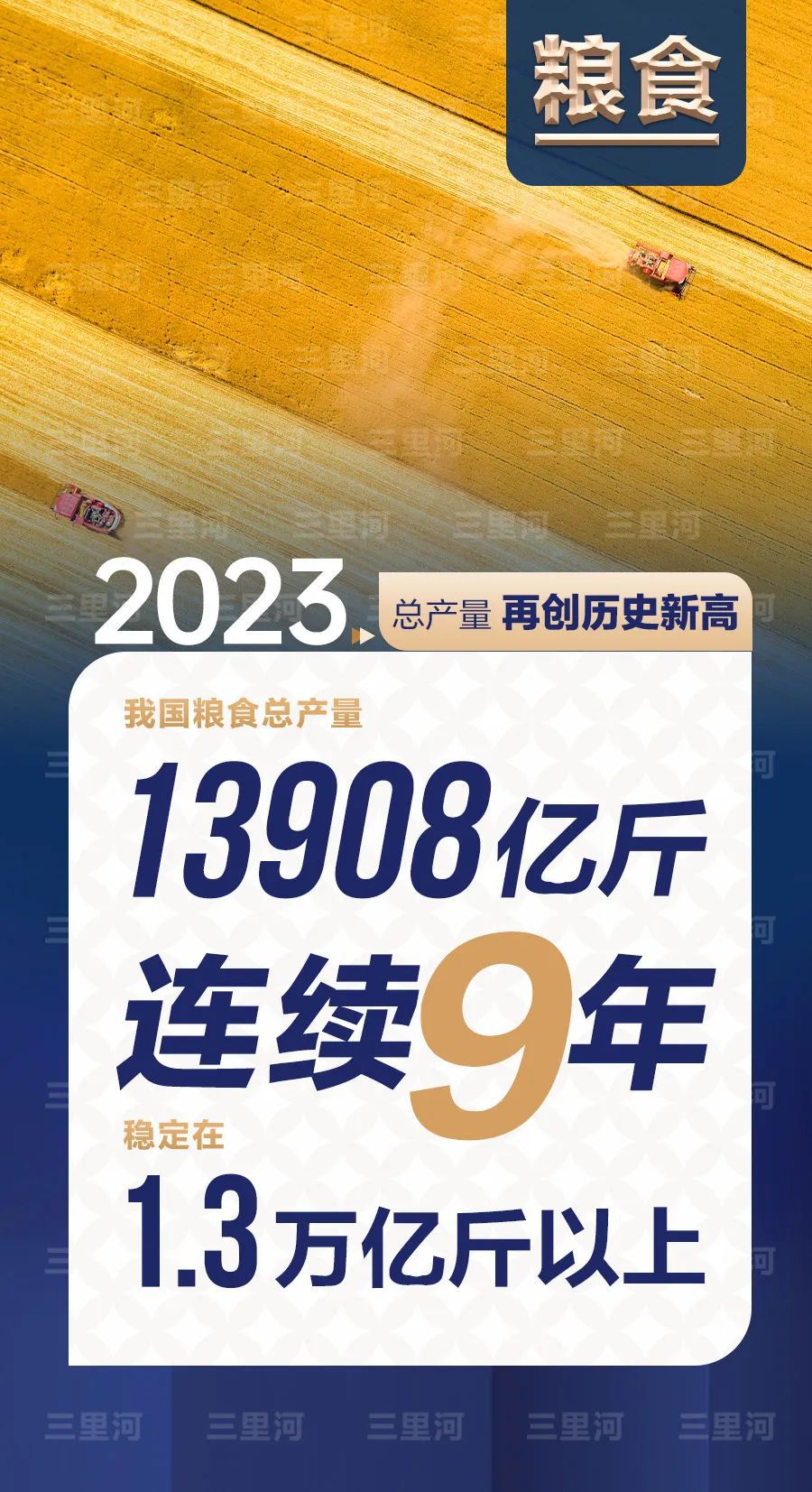 2023年,中國(guó)糧食產(chǎn)量再創(chuàng)歷史新高,連續(xù)9年穩(wěn)定在1.3萬(wàn)億斤以上。
