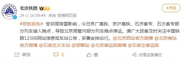 中新網(wǎng)1月16日電 據(jù)北京鐵路微博消息,受鄰局降雪影響,今日京廣高鐵、京滬高鐵、石濟(jì)客專、石太客專部分列車接入晚點(diǎn),導(dǎo)致北京局管內(nèi)部分列車晚點(diǎn)停運(yùn)。北京鐵路請(qǐng)廣大旅客及時(shí)關(guān)注中國(guó)鐵路12306網(wǎng)站信息或車站公告,妥善安排出行。
