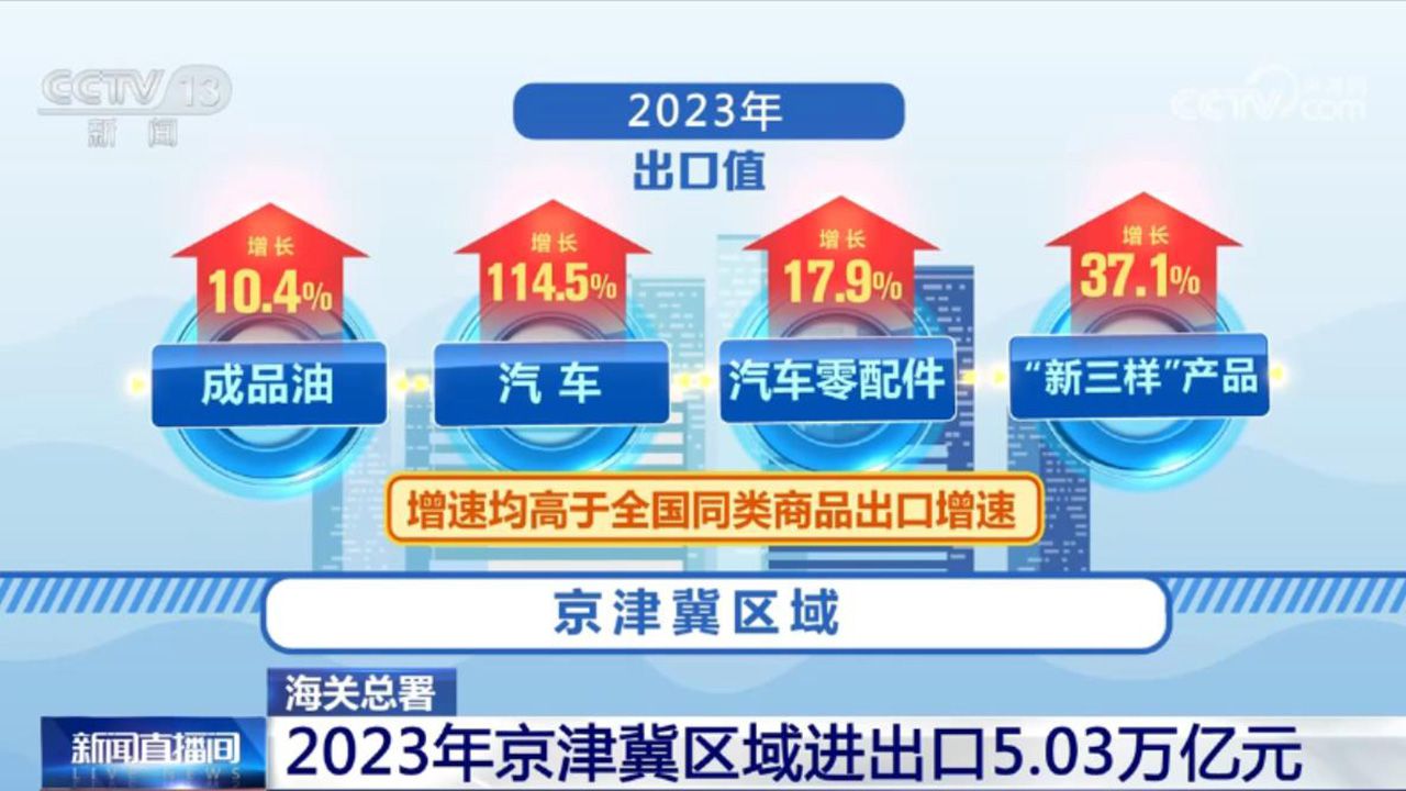 在出口方面,2023年京津冀區(qū)域出口1.31萬億元,增長(zhǎng)2.5%,占全國(guó)出口總值的5.5%,其中,成品油、汽車、汽車零配件、“新三樣”產(chǎn)品的出口值分別增長(zhǎng)10.4%、114.5%、17.9%、37.1%,增速均高于全國(guó)同類商品出口增速。