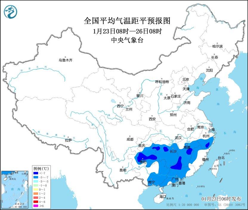 預計,1月23日至25日,貴州、湖南、江西、浙江中南部、福建西部、廣東、廣西中東部等地最低氣溫或平均氣溫較歷史同期偏低5℃以上,其中,貴州中東部、湖南西北部、江西中南部、浙江南部、廣東西北部等地的部分地區(qū)偏低7℃以上,最低氣溫0℃線將位于廣西北部、廣東北部一帶。中央氣象臺1月23日06時繼續(xù)發(fā)布低溫藍色預警。