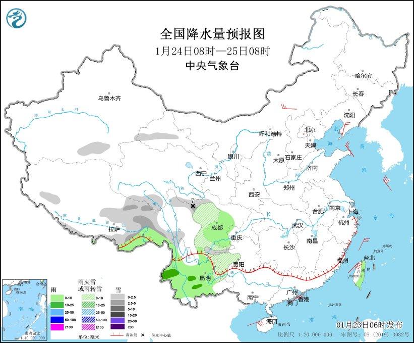 1月25日08時至26日08時,西藏東部、青海南部、甘肅南部、川西高原北部、四川南部、貴州西部、云南東北部和西北部等地部分地區(qū)有小到中雪或雨夾雪。云南大部、貴州西南部等地部分地區(qū)有小到中雨(見圖5)。