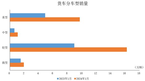2024年1月,貨車產(chǎn)銷分別完成29.2萬輛和28.9萬輛,環(huán)比分別下降6.4%和6.6%,同比分別增長65.9%和81.8%。在貨車細分品種中,與上月相比,重型貨車和中型貨車產(chǎn)銷明顯增長,輕型貨車和微型貨車產(chǎn)銷呈兩位數(shù)下降;與上年同期相比,四大類貨車品種產(chǎn)銷均呈不同程度增長。
