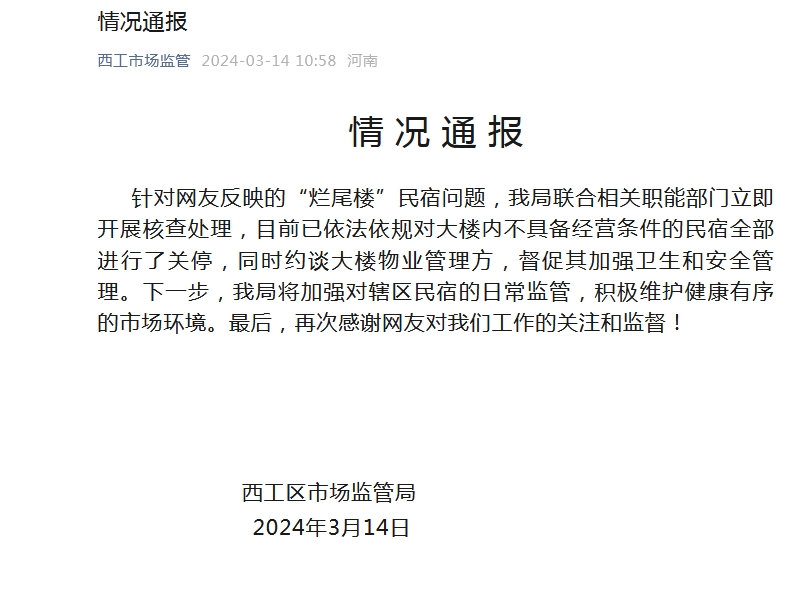 針對網(wǎng)友反映的“爛尾樓”民宿問題,西工區(qū)市場監(jiān)管局聯(lián)合相關職能部門立即開展核查處理,目前已依法依規(guī)對大樓內(nèi)不具備經(jīng)營條件的民宿全部進行了關停,同時約談大樓物業(yè)管理方,督促其加強衛(wèi)生和安全管理。