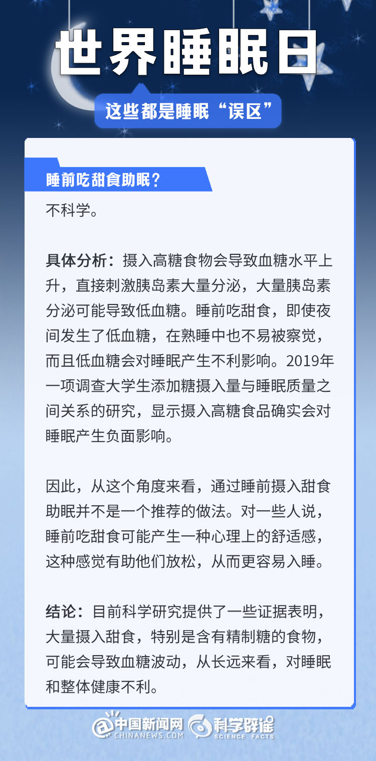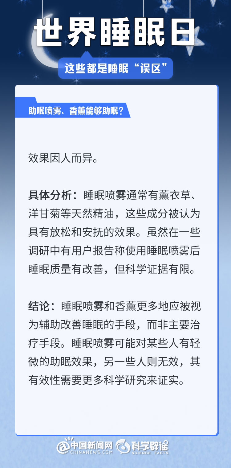 中新網(wǎng)3月21日電 《中國睡眠研究報告(2024)》顯示,2023年居民睡眠指數(shù)為62.61分,較2022年降低了5.16。去年的報告中,曾有近半數(shù)民眾每晚平均睡眠時長不足8小時(47.55%)。很多人正在經(jīng)受著睡眠問題的困擾,為了避免大家被誤導,我們總結(jié)了幾個生活中常見的睡眠誤區(qū),一起來了解一下吧!(來源:科學辟謠 中國新聞網(wǎng)微博)
