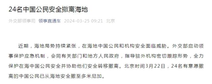 中新網3月25日電 據外交部領事司微信公眾號“領事直通車”25日消息,近期,海地局勢持續(xù)緊張,在海地中國公民和機構安全面臨威脅。外交部啟動領事保護應急機制,會同有關部門和地方人民政府,指導駐外機構密切跟蹤形勢,全力保護在海中國公民安全并協(xié)助他們安全轉移撤離。北京時間3月22日,24名有意愿撤離的中國公民已從海地安全撤至多米尼加。