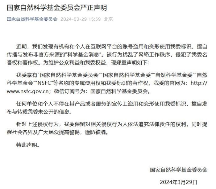 為維護(hù)公眾利益和國家自然科學(xué)基金委員會權(quán)益,國家自然科學(xué)基金委員會鄭重聲明如下: