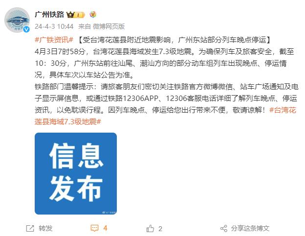 中新網(wǎng)4月3日電 據(jù)中國鐵路廣州局集團有限公司官方微博消息,4月3日7時58分,臺灣花蓮縣海域發(fā)生7.3級地震。為確保列車及旅客安全,截至10:30分,廣州東站前往汕尾、潮汕方向的部分動車組列車出現(xiàn)晚點、停運情況,具體車次以車站公告為準。