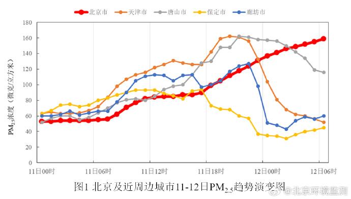 顯著不利氣象條件造成京津冀區(qū)域污染水平快速上升,形成區(qū)域性污染,11日白天北京近周邊石家莊、保定、天津等城市PM2.5快速上升,以3-4級輕中度污染水平為主,部分站點達(dá)到4-5級中重度污染;入夜后近周邊城市PM2.5污染顯著加重,天津唐山等城市達(dá)到5級重度污染水平,北京PM2.5濃度持續(xù)上升,尤其是11日夜間 PM2.5快速上升,12日凌晨至上午達(dá)到4-5級中重度污染水平。