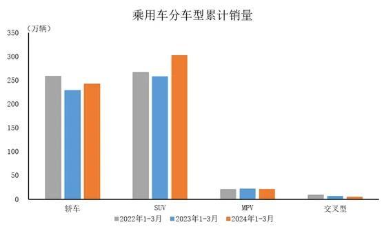 2024年1-3月,在乘用車主要品種中,與上年同期相比,運(yùn)動型多用途乘用車(SUV)產(chǎn)銷呈兩位數(shù)增長,基本型乘用車(轎車)產(chǎn)銷小幅增長,多功能乘用車(MPV)和交叉型乘用車產(chǎn)銷呈不同程度下降。