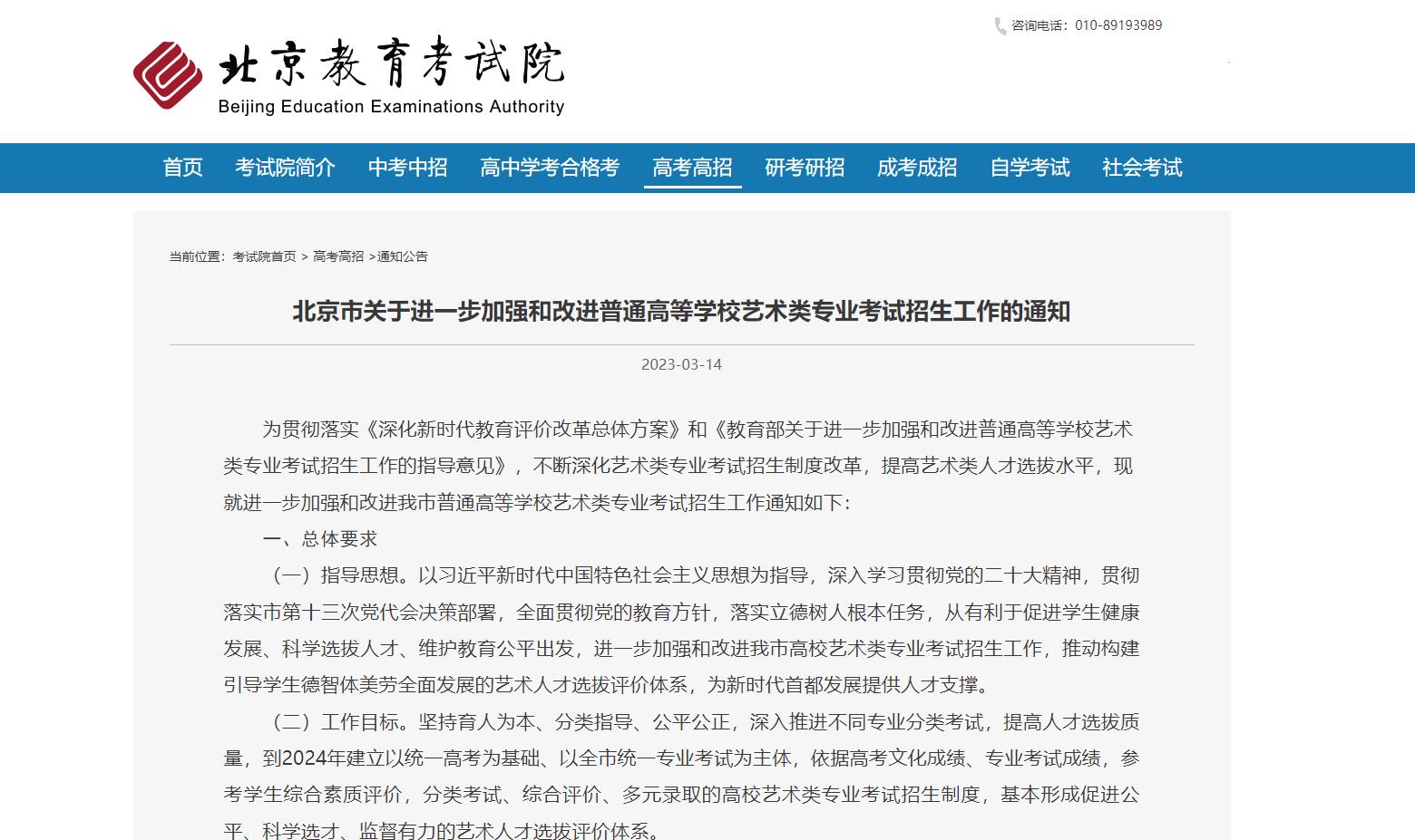 《通知》提到,到2024年全面實施音樂、舞蹈、表(導)演、播音與主持、美術與設計、書法等6個藝術類專業(yè)全市統(tǒng)一專業(yè)考試。