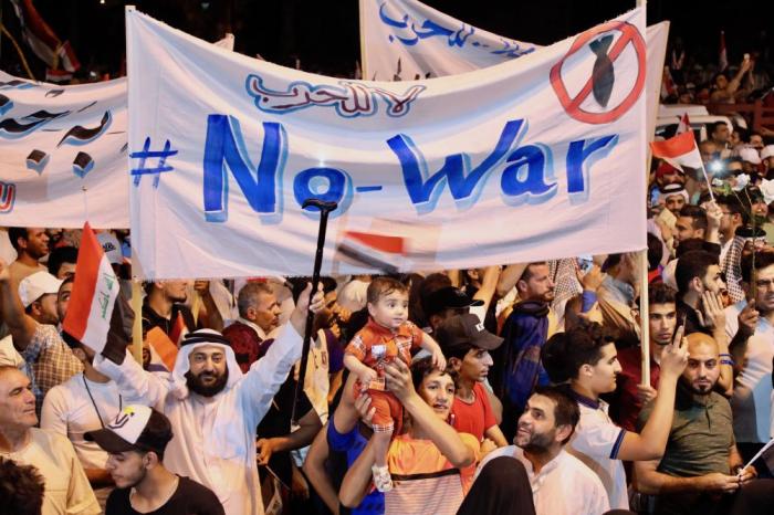 2019年5月24日,在伊拉克首都巴格達,民眾在集會上舉著反戰(zhàn)橫幅。新華社發(fā)(哈利勒·達伍德攝)