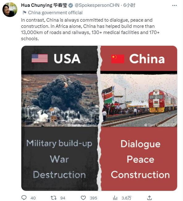 華春瑩接著在第二條推文中發(fā)了一張中美對比圖,圖中顯示美國沉迷于軍事建設(shè)、戰(zhàn)爭和破壞?!跋啾戎拢袊冀K堅持對話、和平、建設(shè)。僅在非洲,中國就援建了1.3萬多公里公路和鐵路、130多個醫(yī)療設(shè)施、170多所學(xué)校?!比A春瑩說。