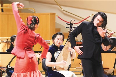 音樂(lè)會(huì)在一曲熱烈歡快的《春節(jié)序曲》中拉開序幕。兩國(guó)樂(lè)團(tuán)合奏的新創(chuàng)曲目《陽(yáng)光永遠(yuǎn)照耀著我們的友誼》融合了中西音樂(lè)特色,令觀眾耳目一新;京劇《貴妃醉酒》向西班牙觀眾展現(xiàn)了中國(guó)傳統(tǒng)戲曲文化的獨(dú)特風(fēng)采;西班牙歌唱家用中文和西文演唱《我愛(ài)你中國(guó)》,以歌聲傳遞了兩國(guó)民眾間的友好情誼;中國(guó)樂(lè)器笙演奏的《西班牙斗牛曲》“混搭”西班牙“國(guó)粹”弗拉門戈舞蹈,更是令人擊節(jié)叫好。兩國(guó)藝術(shù)家以樂(lè)會(huì)友、以藝通心,通過(guò)中西音樂(lè)元素的碰撞與交融,展現(xiàn)了東西方文化的互融互鑒。
