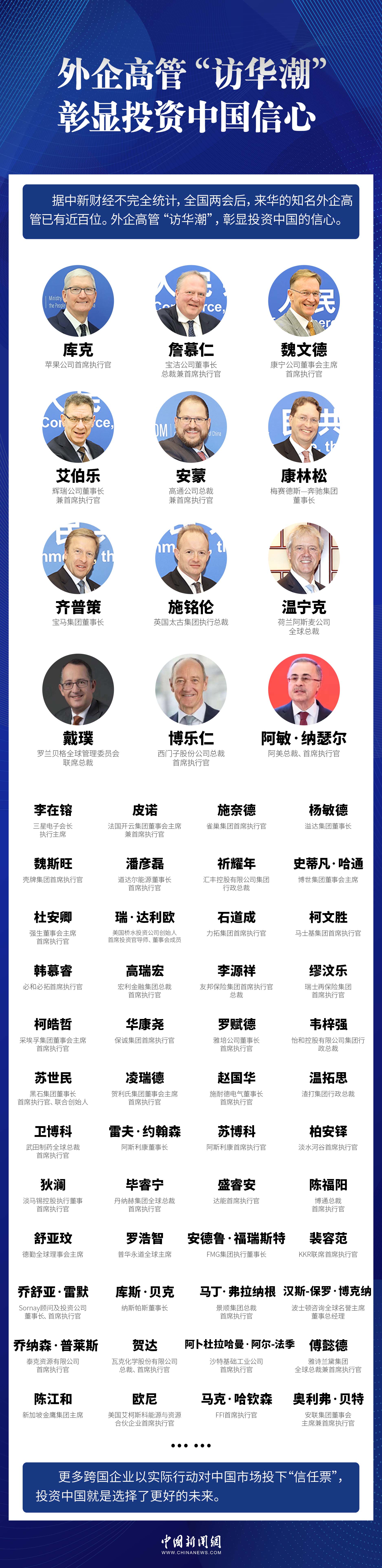 中新網(wǎng)北京4月7日電 (記者 李金磊)時下,外企高管正掀起“訪華潮”。據(jù)中新財經(jīng)不完全統(tǒng)計,全國兩會后,來華的知名外企高管已有近百位。