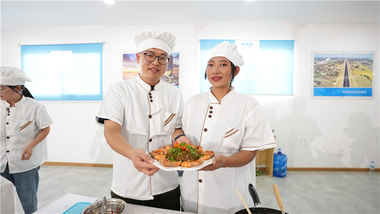 4月6日,柬埔寨新金邊國際機(jī)場(chǎng)項(xiàng)目建設(shè)現(xiàn)場(chǎng),劉曉仙(左)和曼玉良在中國建筑(柬埔寨)職工廚王爭霸賽上展示“中建(柬)一家親”炒米粉。中國建筑供圖