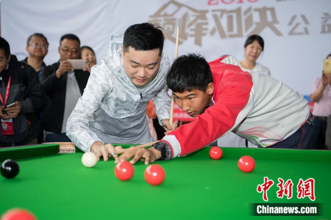 2018“瑞德”斯諾克“巔峰對決”公益活動在西藏啟幕,丁俊暉指導藏族學生打臺球。何蓬磊 攝