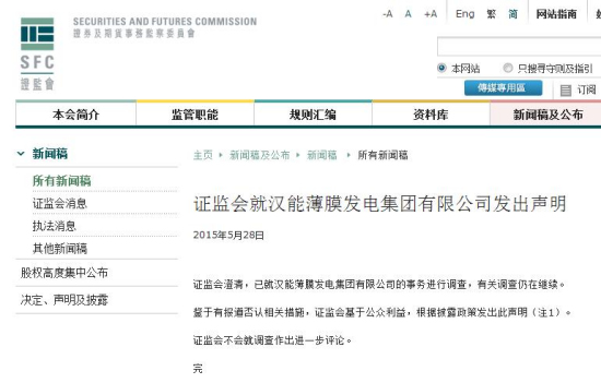 2015年5月28日,香港證監(jiān)會(huì)發(fā)表聲明稱,已就漢能薄膜發(fā)電的事務(wù)進(jìn)行調(diào)查。2015年7月15日,漢能薄膜發(fā)電遭香港證監(jiān)會(huì)勒令停牌。