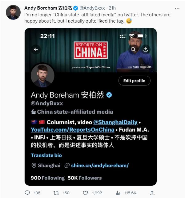 在上海工作生活了近10年的新西蘭媒體人安柏然寫道,“我不再是推特上的‘中國(guó)官方媒體’了。其他人對(duì)此很高興,但我其實(shí)很喜歡這個(gè)標(biāo)簽。”