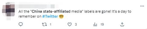 有網(wǎng)友稱,“所有‘中國(guó)官方媒體’的標(biāo)簽都消失了!這是推特上值得紀(jì)念的一天。”
