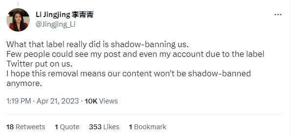 中國(guó)英文主持人李菁菁指出,推特的“官媒”標(biāo)簽實(shí)際是一種“影子禁令”,為暗中設(shè)限提供方便。“由于推特給我們貼上了標(biāo)簽,很少有人能看到我的帖子,甚至很難找到我的賬號(hào)。我希望這次刪除(標(biāo)簽)意味著我們發(fā)布的內(nèi)容不會(huì)再被暗中禁止?!?/p>