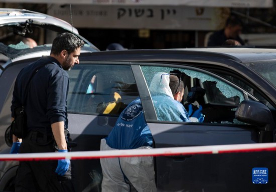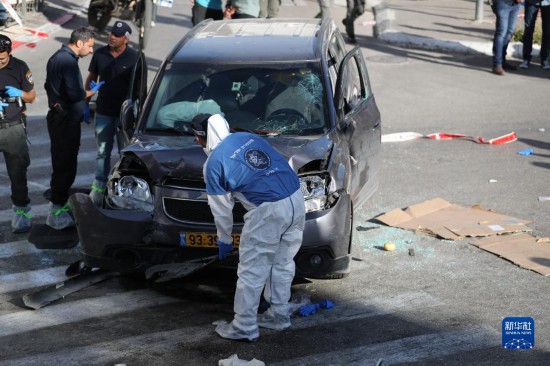 4月24日,警察在耶路撒冷駕車襲擊事件現(xiàn)場工作。新華社記者 陳君清 攝