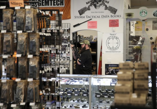 2017年10月4日,在美國拉斯維加斯的“新前線”槍械商店,一名店員為顧客展示槍支。“新前線”是當?shù)匾?guī)模較大的一家槍械商店,售賣槍支彈藥、槍周邊用品、槍文化衍生品等。新華社記者王迎攝