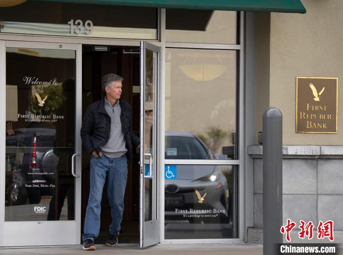 當(dāng)?shù)貢r間5月1日,一名男子走出位于美國加州米爾布雷市的一家第一共和銀行。 中新社記者 劉關(guān)關(guān) 攝