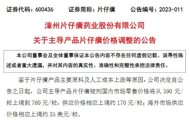 此番漲價的消息源于片仔癀5日發(fā)布的一則公告,其中提到,公司決定自公告之日起,主導(dǎo)產(chǎn)品片仔癀錠劑國內(nèi)市場零售價格將從590元/粒上調(diào)到760元/粒,供應(yīng)價格相應(yīng)上調(diào)約170元/粒;海外市場供應(yīng)價格相應(yīng)上調(diào)約35美元/粒。