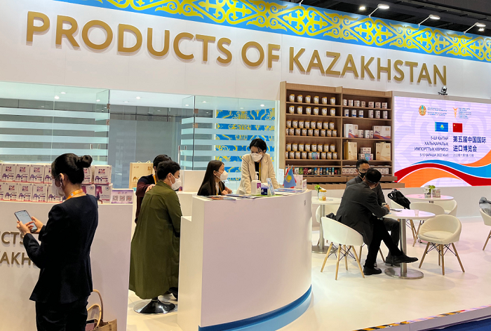 這是2022年11月6日在第五屆進博會上拍攝的哈薩克斯坦產(chǎn)品展區(qū)。 新華社記者 鄭冬睿 攝