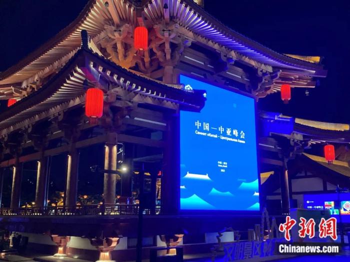2023年5月11日,西安,曲江池遺址公園夜色闌珊。中國-中亞峰會(huì)宣傳牌點(diǎn)亮,峰會(huì)即將在西安召開。李溪龍 攝