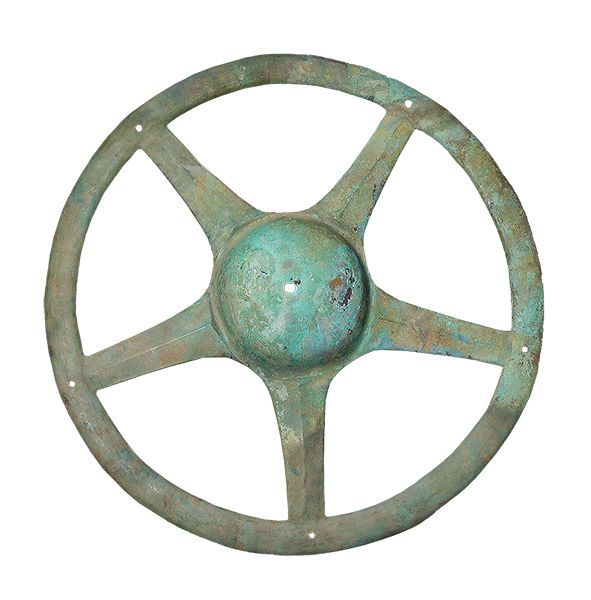 三星堆出土文物中,青銅太陽輪形似如今的“方向盤”,其用途引來了種種猜測(cè):有研究者認(rèn)為這是車輪,還有觀點(diǎn)認(rèn)為是用于軍事作戰(zhàn)的盾牌上的盾飾。多數(shù)意見認(rèn)為,這種形制的器物應(yīng)即是“太陽形器”。它是常設(shè)在古蜀國(guó)神廟中的神器,或用于祭祀儀式。