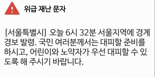 “今天6時(shí)32分首爾地區(qū)發(fā)布警戒警報(bào)。請(qǐng)各位國(guó)民做好躲避準(zhǔn)備,讓兒童和老弱者優(yōu)先躲避?!碑?dāng)天清晨,首爾市民收到這條危急災(zāi)害通知,手機(jī)同時(shí)響起警笛聲。