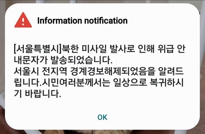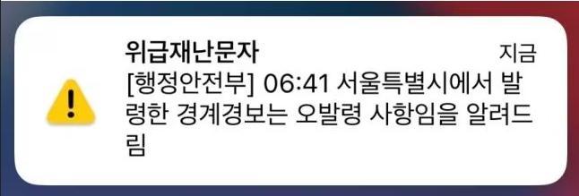 7時(shí)3分,首爾市民再次收到消息:“首爾特別市發(fā)布的警戒警報(bào)屬于誤發(fā)事項(xiàng),特此通知。”