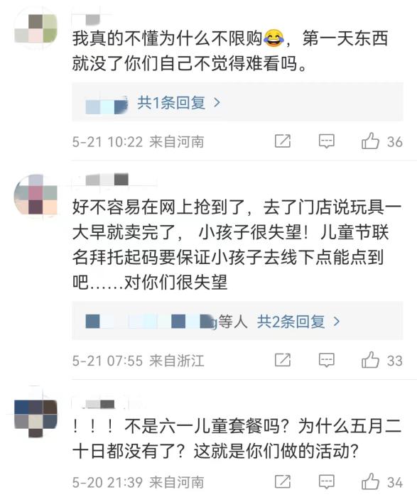 但自5月20日起,在社交平臺上,就不斷有人反映,已經(jīng)買不到肯德基兒童節(jié)限定玩具??系禄墓俜轿⒉┫拢灿泻芏嗳肆粞?,門店已售罄,能不能補貨。