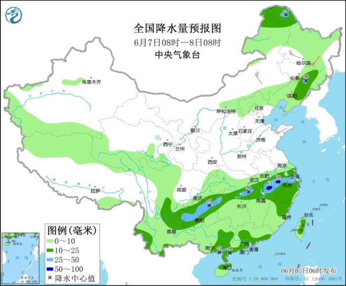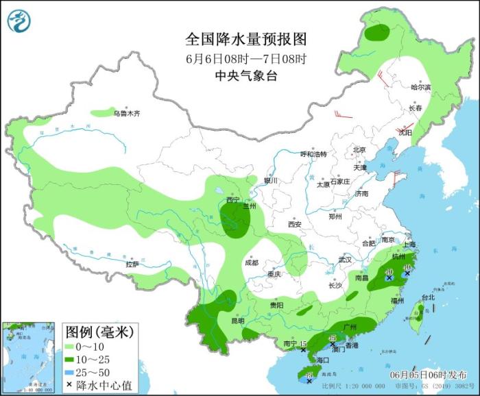 6月6日08時至7日08時,內(nèi)蒙古東北部、東北地區(qū)東部和北部、青藏高原北部、甘肅中南部、江南東部和南部、西南地區(qū)大部、華南、臺灣島等地部分地區(qū)有小到中雨,局地有大雨(25~45毫米)。內(nèi)蒙古中東部、東北地區(qū)南部、山東半島等地部分地區(qū)有4~5級風(fēng)(見圖2)。