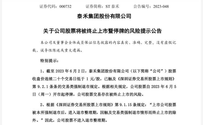 6月2日晚間,ST泰禾公告,截至當(dāng)日,公司股票收盤價(jià)連續(xù)20個(gè)交易日低于1元/股,已觸及交易類強(qiáng)制退市規(guī)定。根據(jù)相關(guān)規(guī)定,公司股票自6月5日開市起停牌,公司股票交易存在被終止上市的風(fēng)險(xiǎn)。