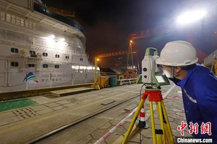 6月1日凌晨2時(shí),中國(guó)首艘國(guó)產(chǎn)大型郵輪“愛(ài)達(dá)·魔都號(hào)”開(kāi)始注水起浮,工作人員對(duì)船體相關(guān)數(shù)據(jù)進(jìn)行檢測(cè)。殷立勤 攝