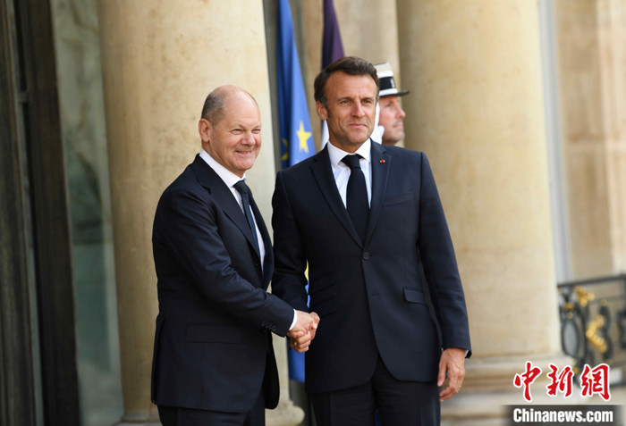 當(dāng)?shù)貢r間6月12日晚,法國總統(tǒng)馬克龍在巴黎愛麗舍宮會見德國總理朔爾茨。朔爾茨前來出席當(dāng)天舉行的法德波三國領(lǐng)導(dǎo)人會談。 中新社記者 李洋 攝