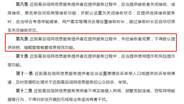 征求意見稿還提出,近距離自組網(wǎng)信息服務(wù)提供者在提供服務(wù)過程中,應(yīng)當(dāng)提供接收者關(guān)閉接收、選擇接收、黑名單自動(dòng)拒絕等接收功能,并默認(rèn)設(shè)置為關(guān)閉接收狀態(tài)。(完)