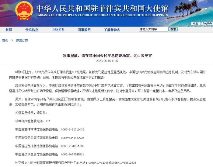 中新網6月16日電 據中國駐菲律賓大使館網站消息,6月15日上午,菲律賓呂宋島八打雁省發(fā)生6.2級地震,首都大馬尼拉地區(qū)震感強烈。中國駐菲律賓使館立即啟動應急機制,及時為在菲中國公民提供領事保護和協(xié)助。目前,未接到有中國公民在地震中傷亡的報告。